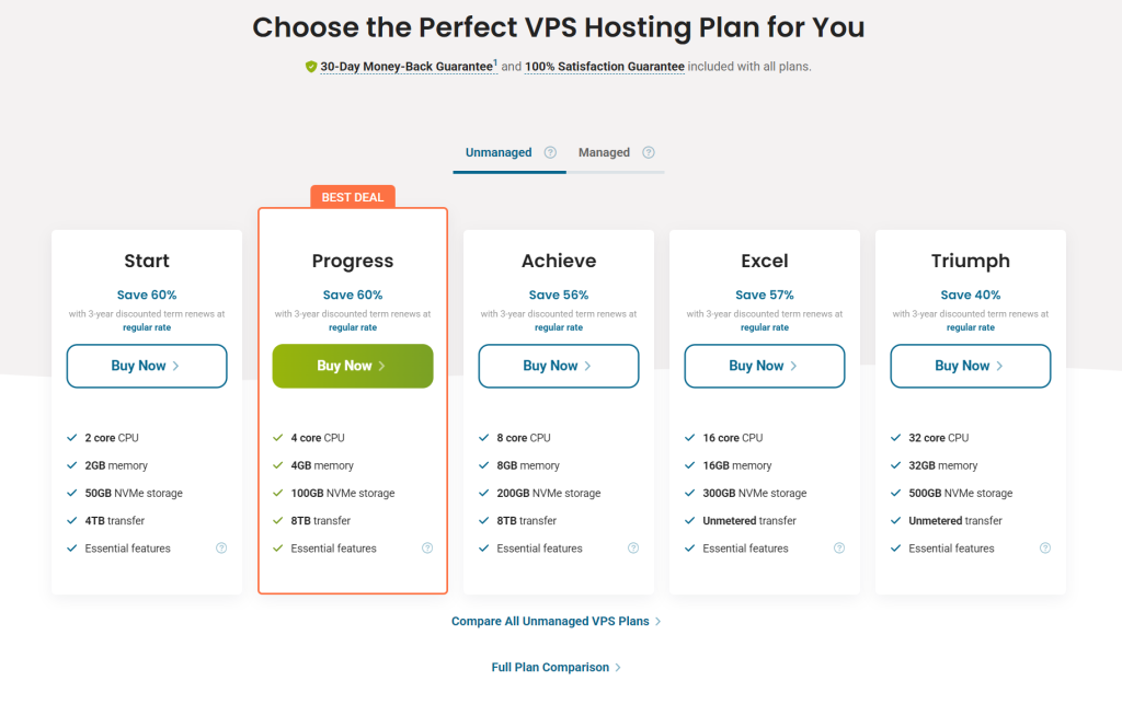 If you have more technical experience, you can take greater control of updates and server tuning yourself with an unmanaged VPS Hosting plan. Unmanaged VPS Hosting, in turn, reflects in lower pricing.