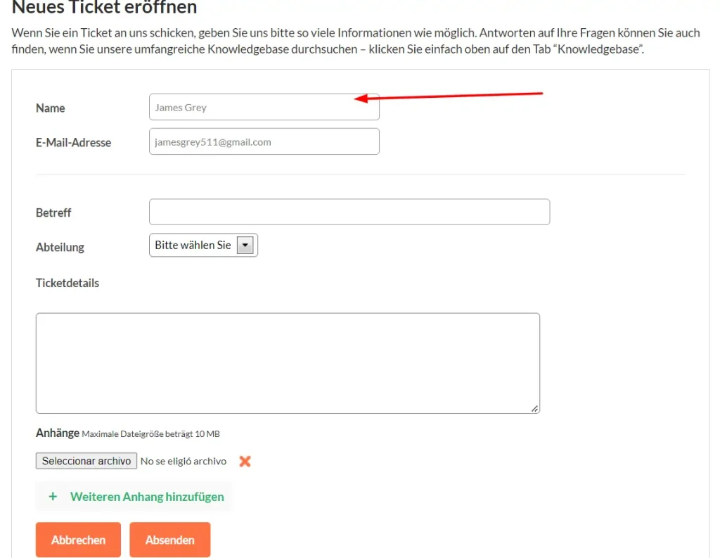5. Geben Sie einen Betreff ein, wählen Sie die Abteilung, an die Sie schreiben wollen und geben Sie die Ticket-Kommentare ein.