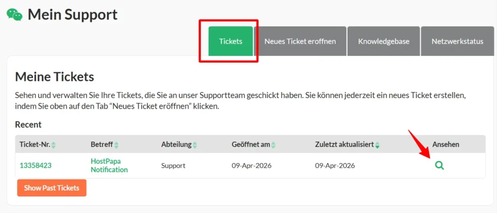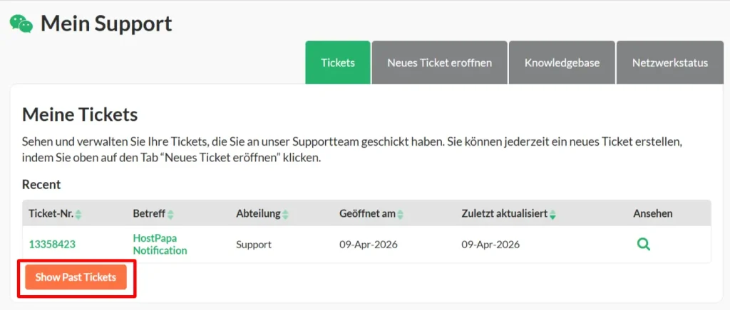 Du kannst auch geschlossene Tickets anzeigen, indem du auf Show Past Tickets klickst.