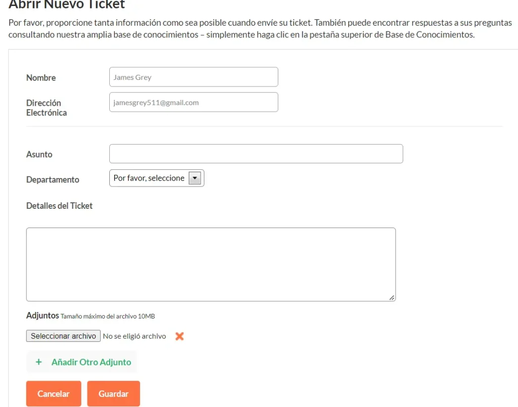 5. Agrega un Tema, elige el Departamento al cual deseas enviar el ticket e introduce los Detalles del Ticket.