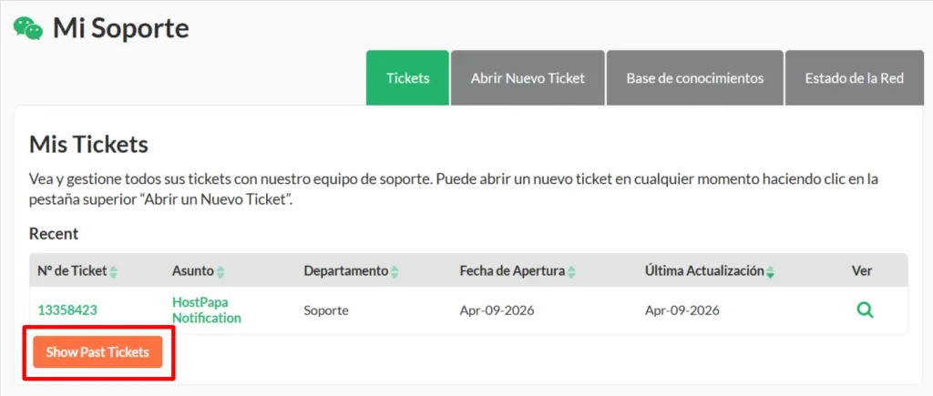 También puedes ver los tickets cerrados haciendo clic en Show Past Tickets.