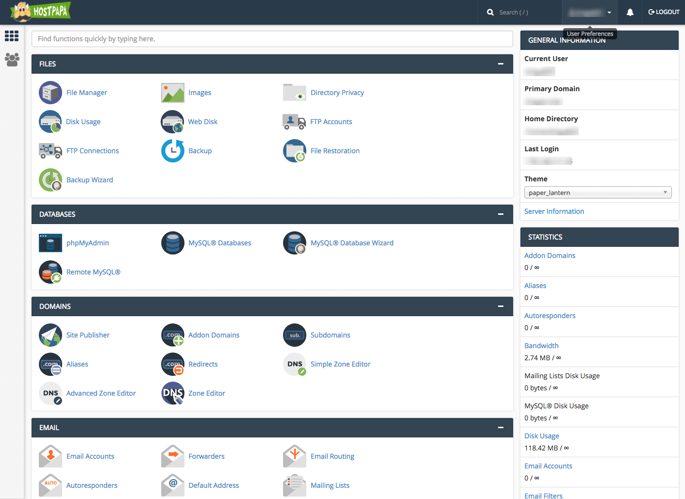 cPanel es un escritorio de usuario final, para gestionar cuentas de hosting individuales. Está disponible en todos los servicios de hosting de HostPapa.