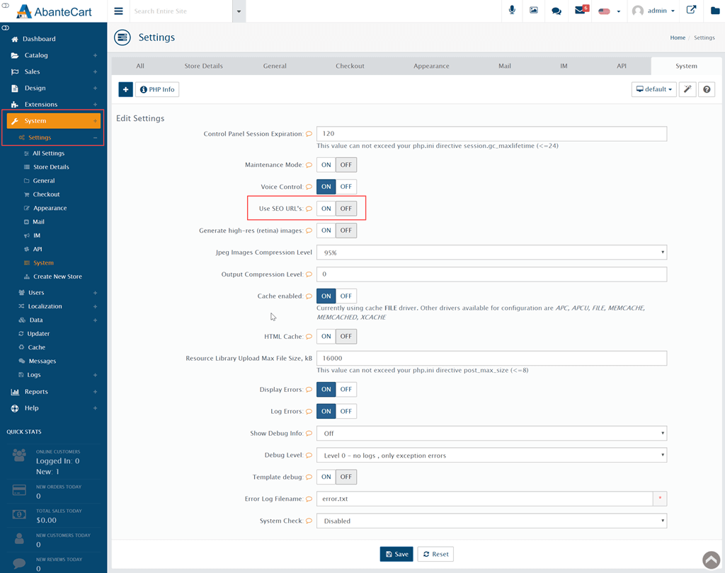 In the AbanteCart administration dashboard, head to System > Settings > System and select the On button next to Use SEO URLs.