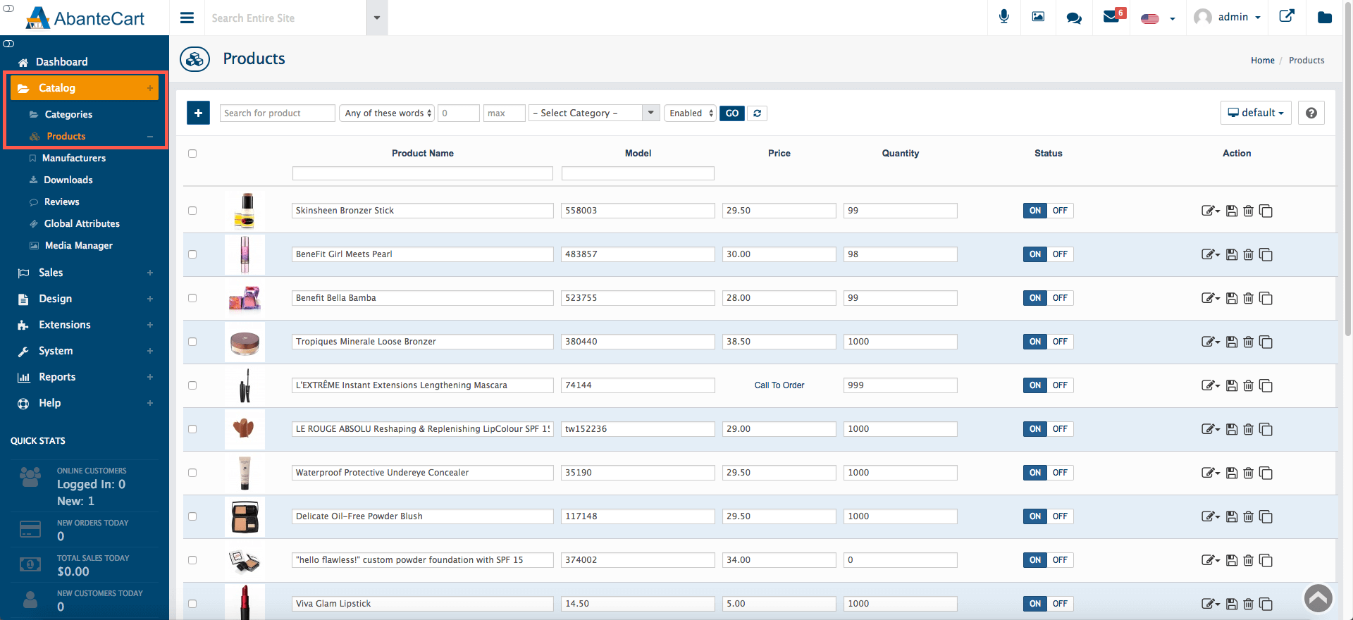 To list your product inventory in AbanteCart, head to Catalog > Products in the administration dashboard. You’ll be presented with a list, including the product name, model, price, quantity, status and the standard AbanteCart action buttons (Edit, Save, Delete and Clone).