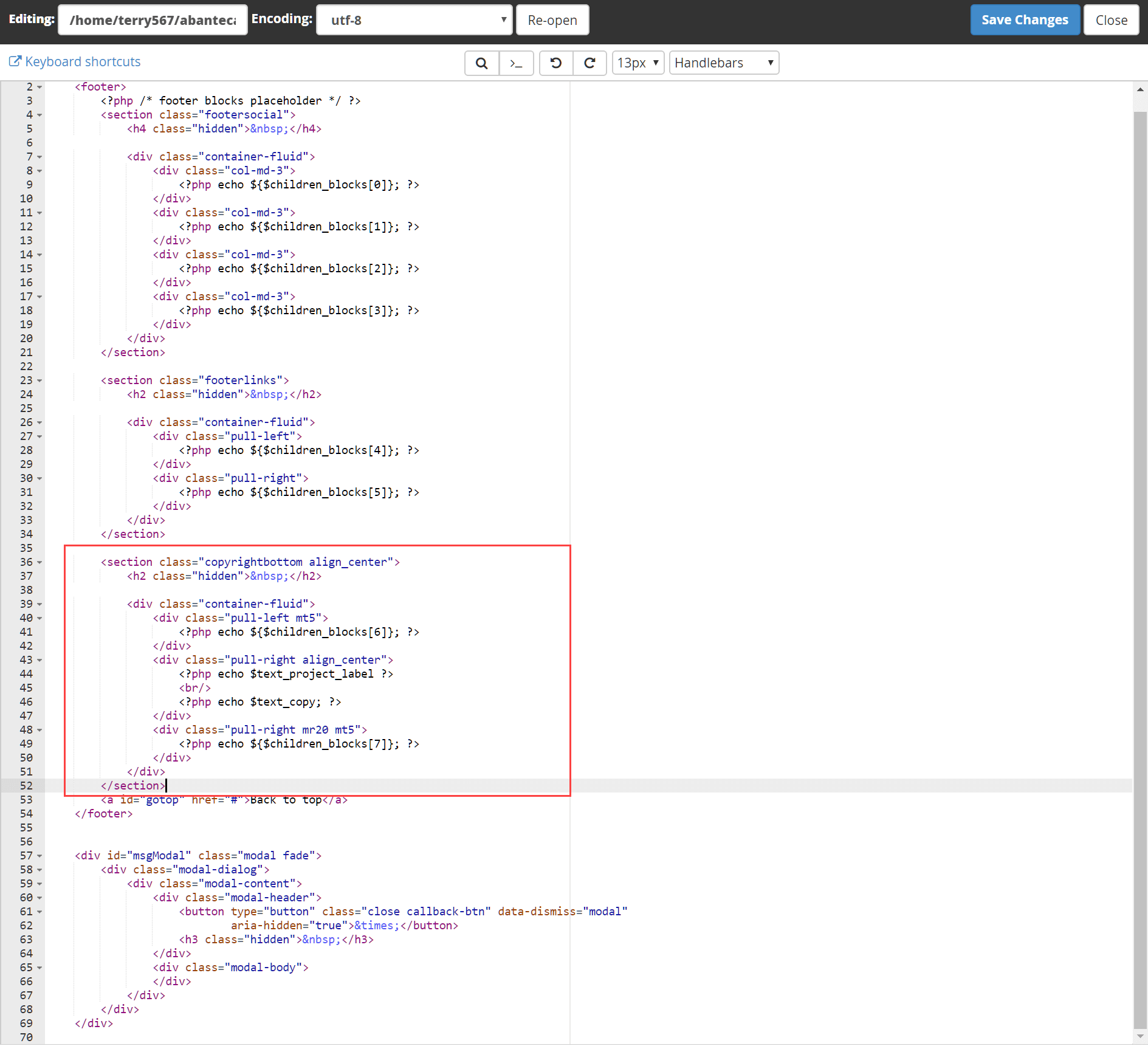 To edit the AbanteCart footer template manually, you’ll need to access the footer.tpl file using an FTP client or the cPanel File Manager. The file is located in your AbanteCart folder at storefront/view/your-theme-name/template/common.